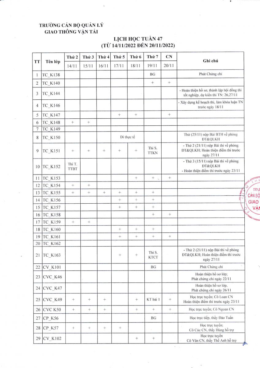Lịch học tuần 47 ( từ 14/11/2022 - 20/11/2022)
