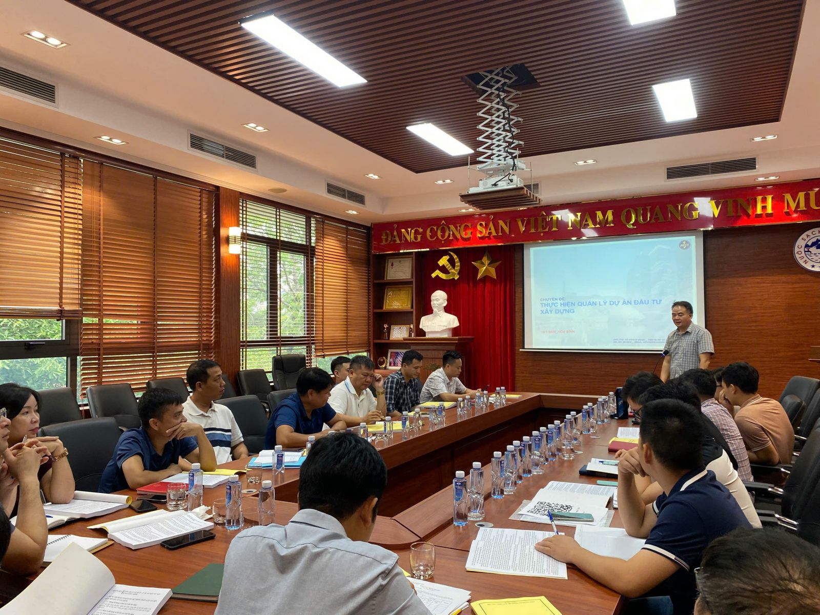 Giảng viên chính - Vũ Hoàng Ngọc đang truyền đạt kiến thức tại lớp Bồi dưỡng nghiệp vụ Quản lý dự án đầu tư xây dựng cho CBNV Công ty Cổ phần Nước sạch Hoà Bình.