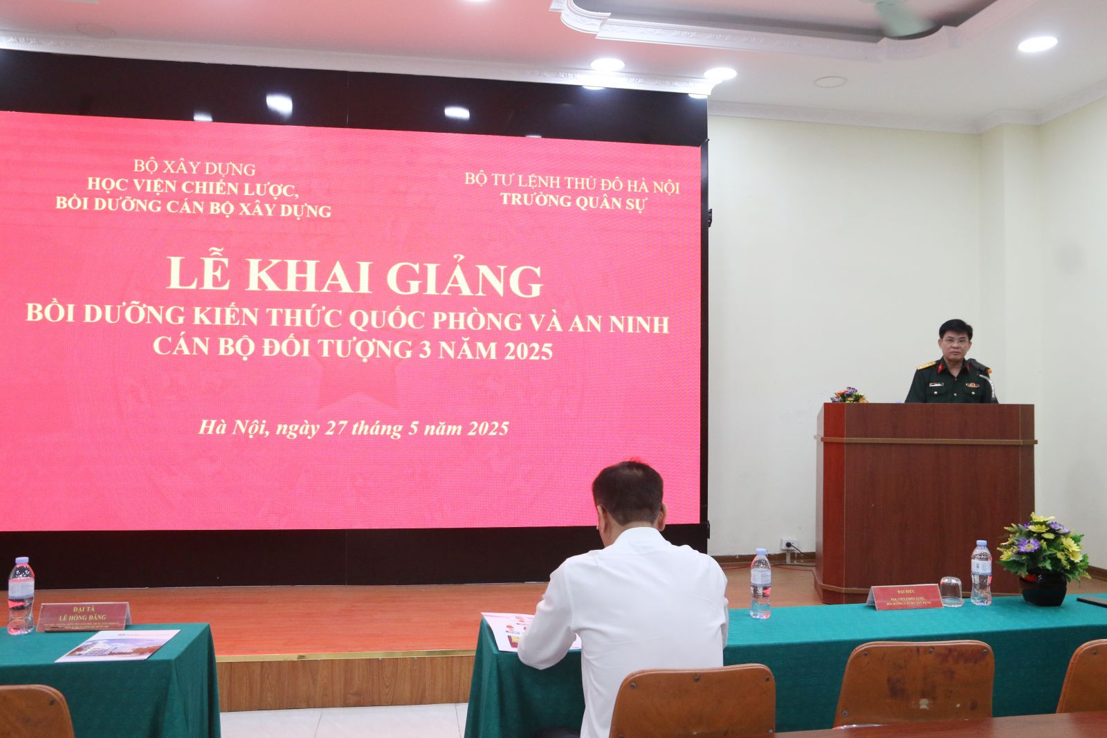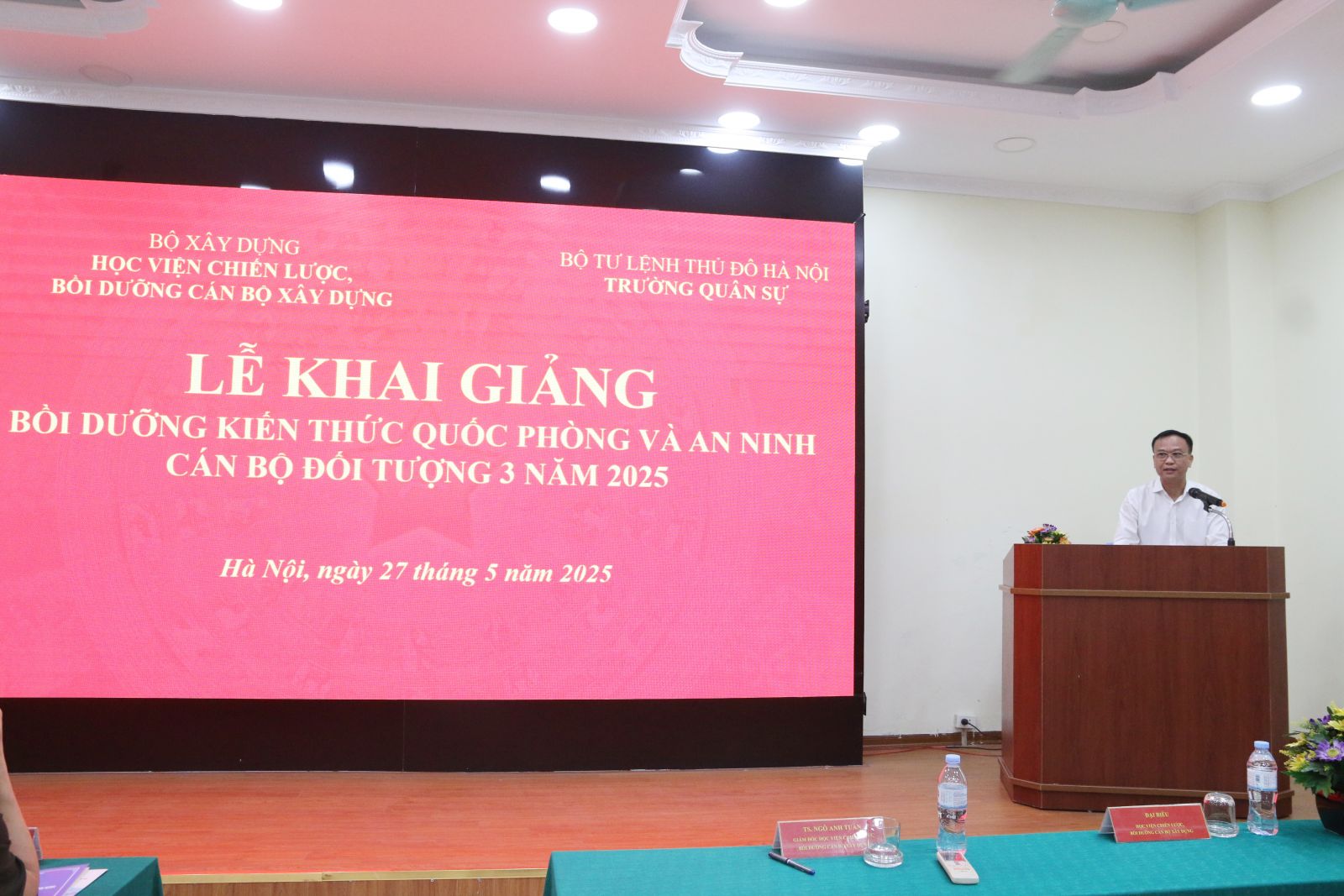 Ngày 27/5/2025, Học viện Chiến lược, bồi dưỡng cán bộ xây dựng (ACST/Học viện) phối hợp với Trường Quân sự Bộ Tư lệnh Thủ đô Hà Nội tổ chức khai giảng lớp Bồi dưỡng kiến thức quốc phòng và an ninh đối tượng 3 cho gần 130 học viên là trưởng, phó phòng và tương đương đang công tác tại các đơn vị trực thuộc Bộ Xây dựng.