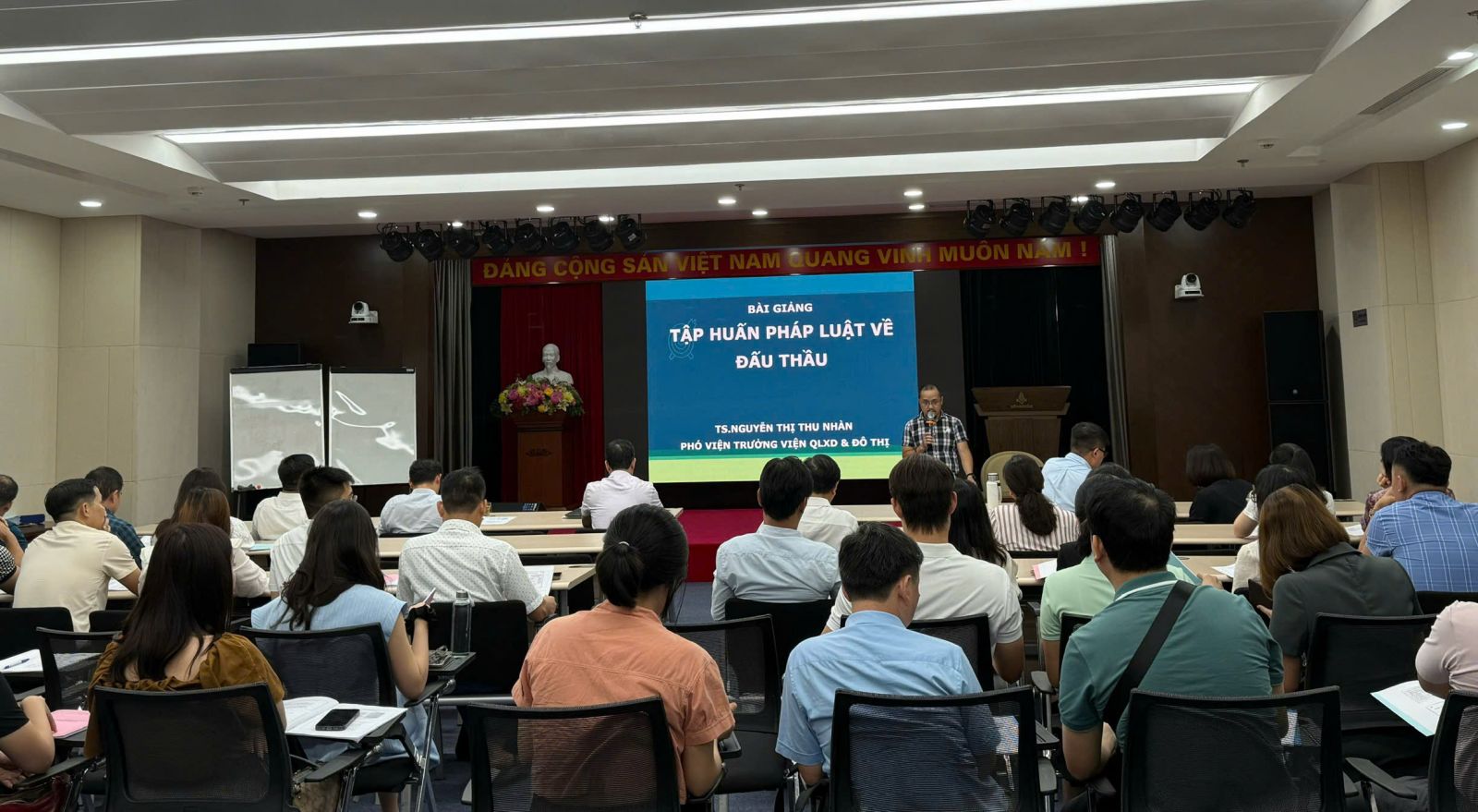 Lớp Tập huấn diễn ra trong ngày 12/8/2025, với sự tham gia truyền đạt kiến thức của TS.Nguyễn Thị Thu Nhàn - Phó Viện trưởng Viện Quản lý xây dựng và đô thị - thuộc Học viện là người có trình độ chuyên môn cao, có nhiều kinh nghiệm thực tế đồng thời có phương pháp giảng dạy khoa học sẽ giúp các học viên dễ dàng nắm bắt kiến thức nằm trong các chuyên đề: Luật Đấu thầu số 22/2023/QH15, Luật số 57/2024/QH15, Luật số 90/2025/QH15; Nghị định 24/2024/NĐ-CP quy định chi tiết một số điều và biện pháp thi hành Luật Đấu thầu về lựa chọn nhà thầu; Nghị định số 17/2025/NĐ-CP của Chính phủ về sửa đổi, bổ sung một số điều của các Nghị định quy định chi tiết một số điều và biện pháp thi hành Luật Đấu thầu.