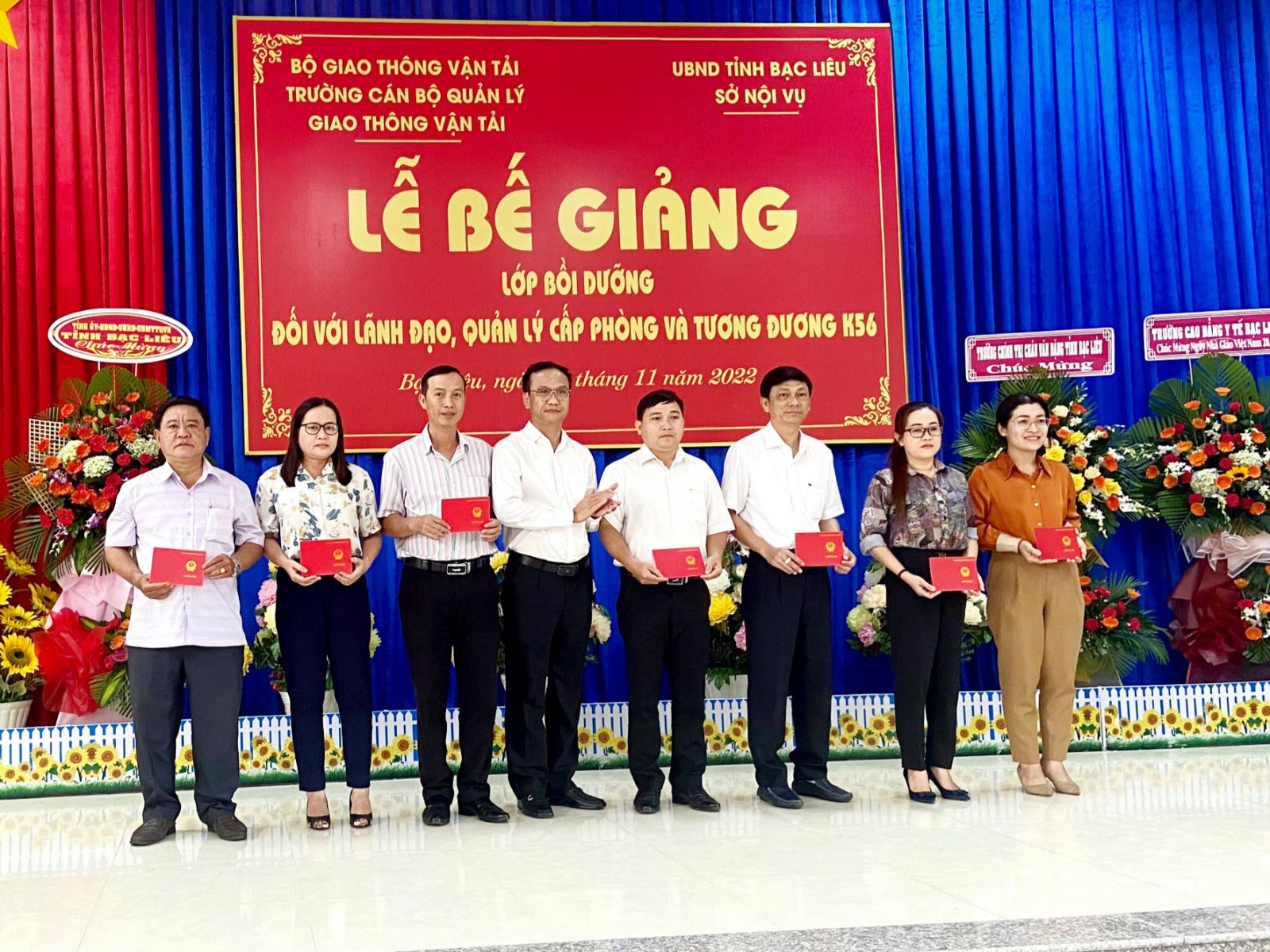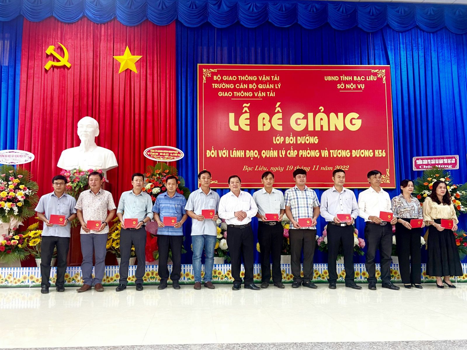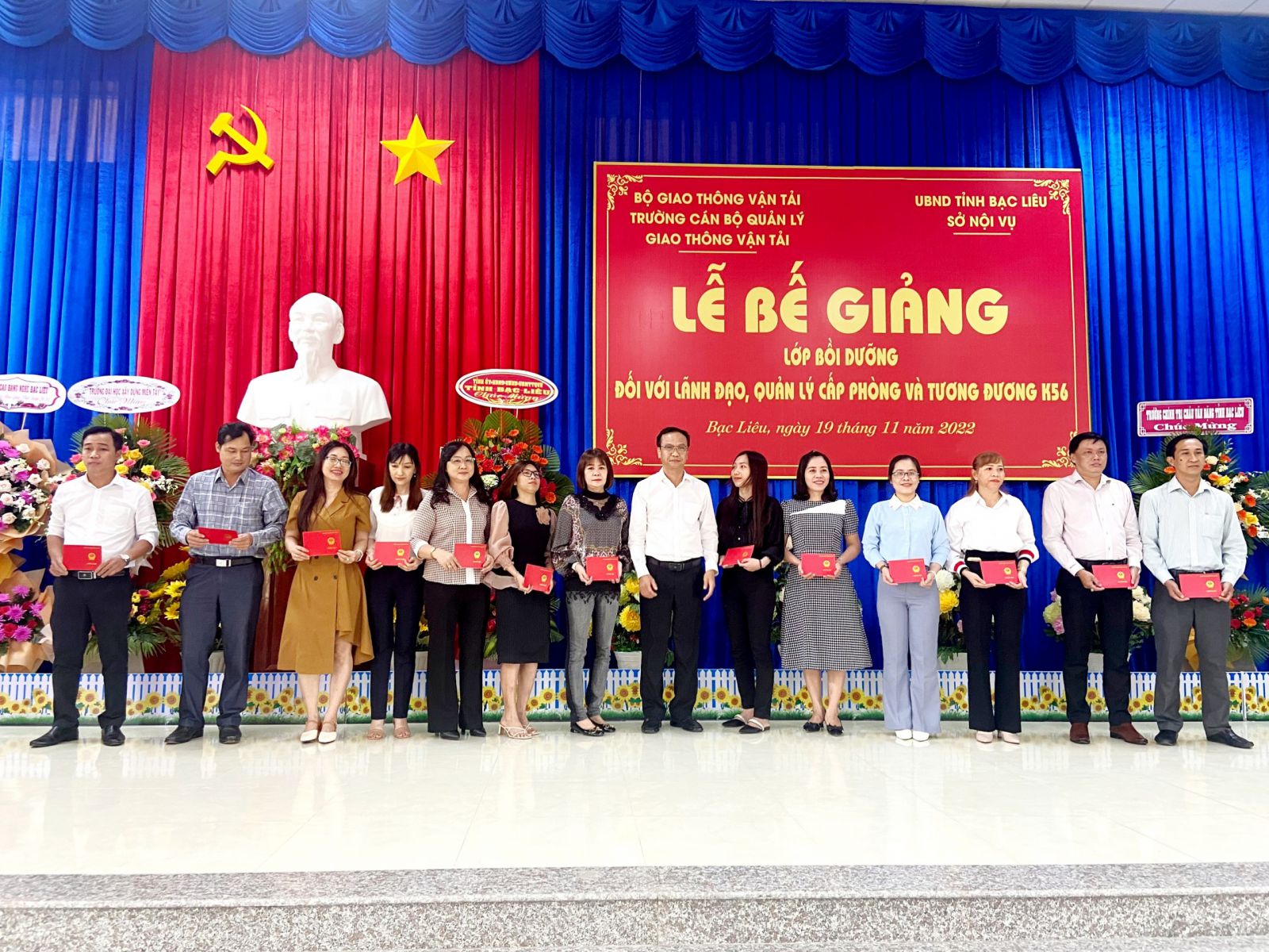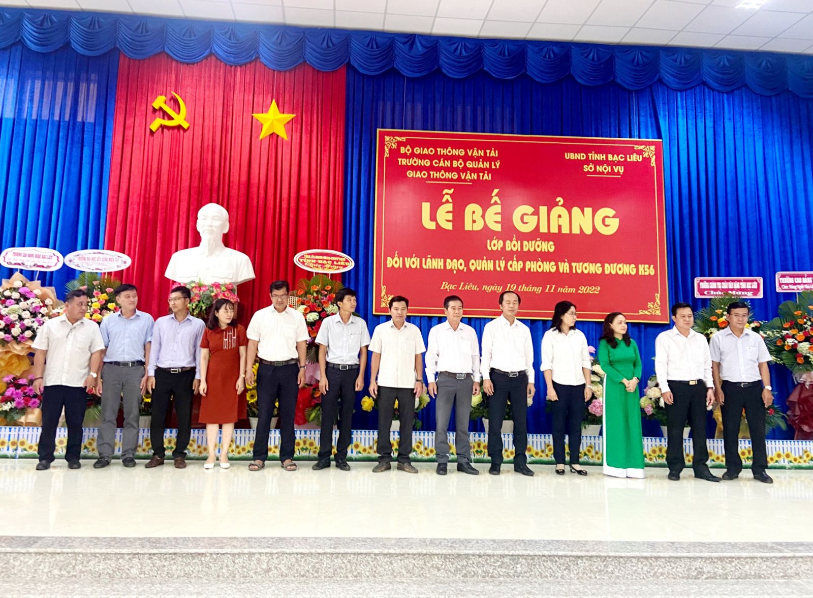 Ngày 19/11/2022, Trường Cán bộ quản lý giao thông vận tải phối hợp với Sở Nội vụ tỉnh Bạc Liêu tổ chức Lễ bế giảng lớp Bồi dưỡng lãnh đạo quản lý cấp phòng và tương đương K56 dành cho học viên là công chức, viên chức đang công tác tại các cơ quan quản lý nhà nước, các đơn vị sự nghiệp công lập trên địa bàn tỉnh Bạc Liêu và các khu vực lân cận.
