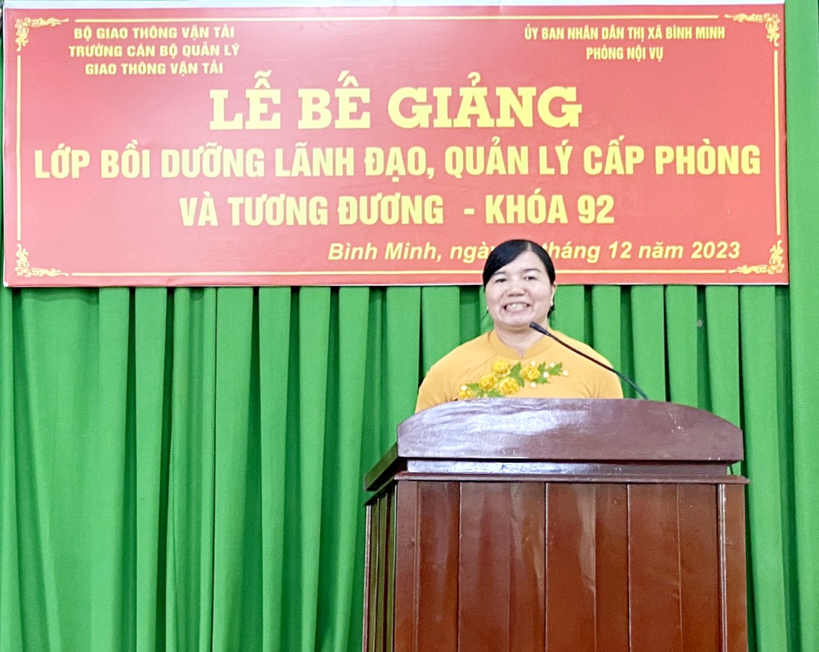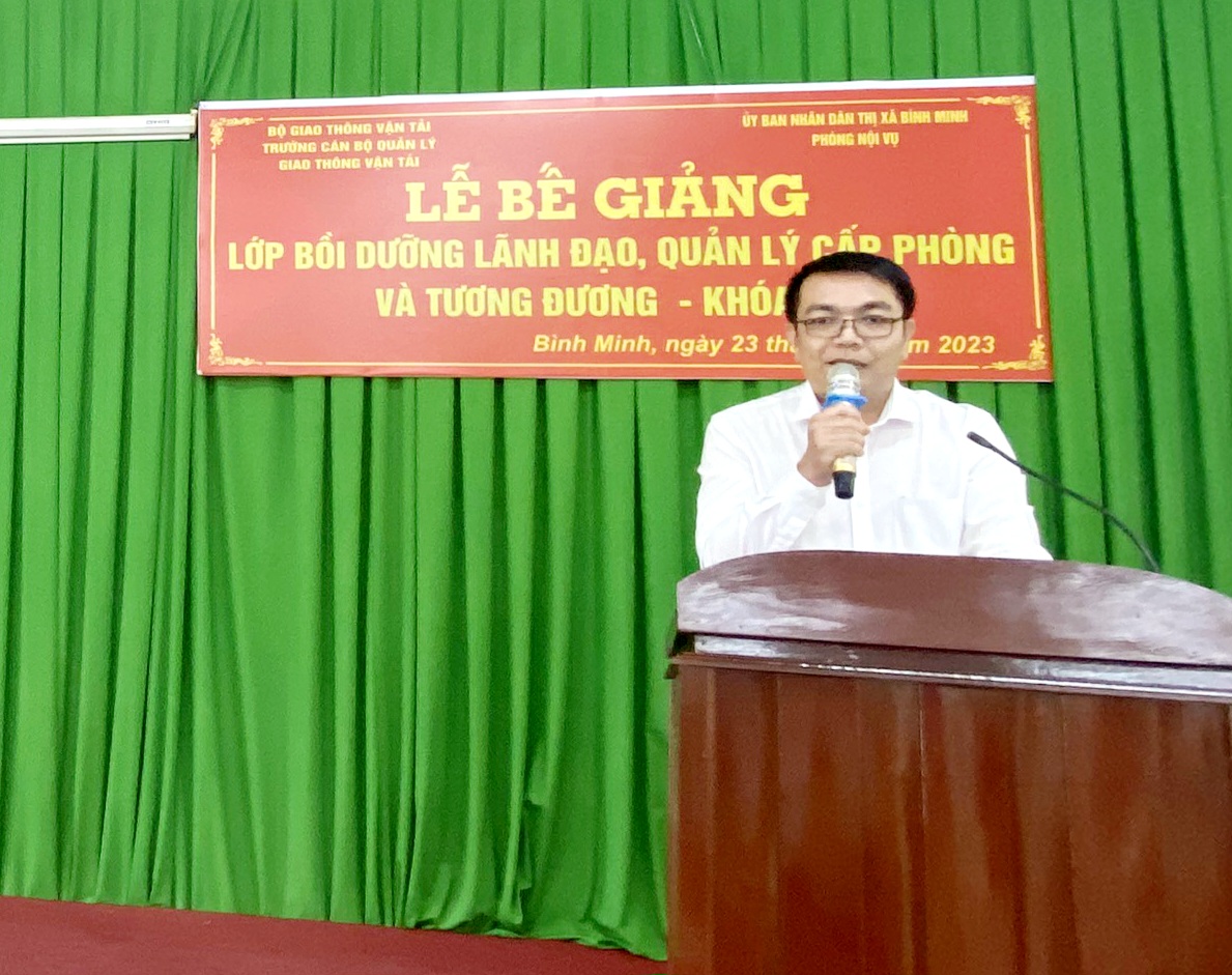 Thay mặt các học viên tham gia lớp học, Đồng chí Nguyễn Hoài Hận, Hiệu trưởng Trường Tiểu học Nguyễn Thị Minh Khai, thị xã Bình Minh, tỉnh Vĩnh Long phát biểu cảm ơn Lãnh đạo Ủy ban nhân dân thị xã Bình Minh, Phòng Nội vụ thị xã Bình Minh, Ban giám hiệu Trường Cán bộ quản lý giao thông vận tải, Ban tổ chức lớp học đã phối hợp, tạo mọi điều kiện thuận lợi làm lên sự thành công của lớp học.