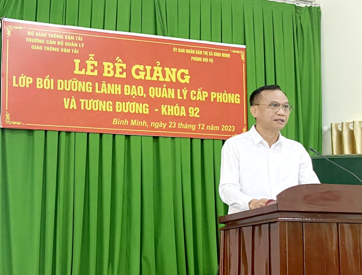 Ngày 23/12/2023, Trường Cán bộ quản lý giao thông vận tải phối hợp với Phòng Nội vụ thị xã Bình Minh, tỉnh Vĩnh Long tổ chức Lễ bế giảng lớp Bồi dưỡng lãnh đạo quản lý cấp phòng và tương đương K92 dành cho học viên là công chức, viên chức đang công tác tại các cơ quan quản lý nhà nước, các đơn vị sự nghiệp công lập trên địa bàn thị xã Bình Minh, tỉnh Vĩnh Long. Đây là lớp học được Trường Cán bộ quản lý giao thông vận tải tham gia phối hợp tổ chức thông qua hình thức chào giá cạnh tranh trên Hệ thống mạng đấu thầu Quốc gia.