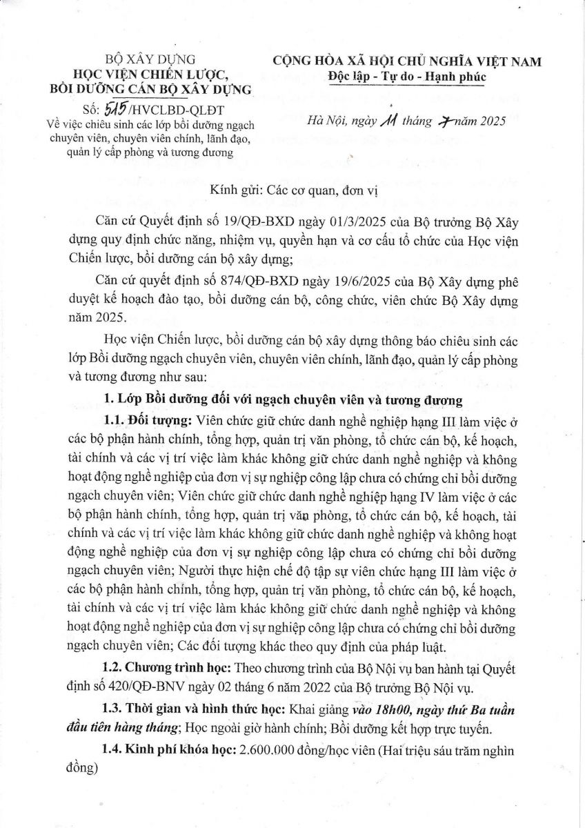 Đăng ký ONLINE các lớp Bồi dưỡng ngạch chuyên viên, chuyên viên chính, lãnh đạo, quản lý cấp phòng và tương đương 12/08/2025 Lượt truy cập : 350 Bình luận : 0 Chia sẻ : Thêm bình luận mới Bình luận của bạn đã được gửi thành công. Cảm ơn bạn! Làm mới Lỗi. Vui lòng thử lại Gửi bình luận