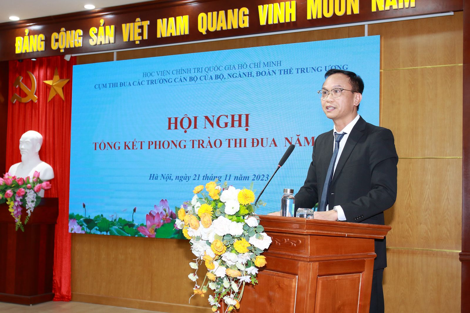 Báo cáo tổng kết cho thấy năm 2023, các thành viên Cụm thi đua các trường Cán bộ của các Bộ, ngành, đoàn thể, Trung ương – Học viện Chính trị Quốc gia Hồ Chí Minh đã triển khai đến viên chức, người lao động Nhà Trường phong trào thi đua với chủ đề “Chủ động - Đồng bộ - Đột phá - Kỷ cương - Chất lượng - Hiệu quả" nhằm nâng cao chất lượng trong công tác của viên chức, người lao động, đổi mới tư duy, đẩy mạnh việc ứng dụng công nghệ thông tin trong công tác đào tạo, bồi dưỡng trong các trường, học viện; thực hành tiết kiệm, chống lãng phí, cải cách hành chính. Ngay từ đầu năm, Cụm Thi đua các Trường cán bộ của các Bộ, Ngành, Đoàn thể Trung ương đã xây dựng kế hoạch và phát động phong trào thi đua đến từng Trường/Học viện trong Cụm với nhiều nội dung phong phú, thiết thực.