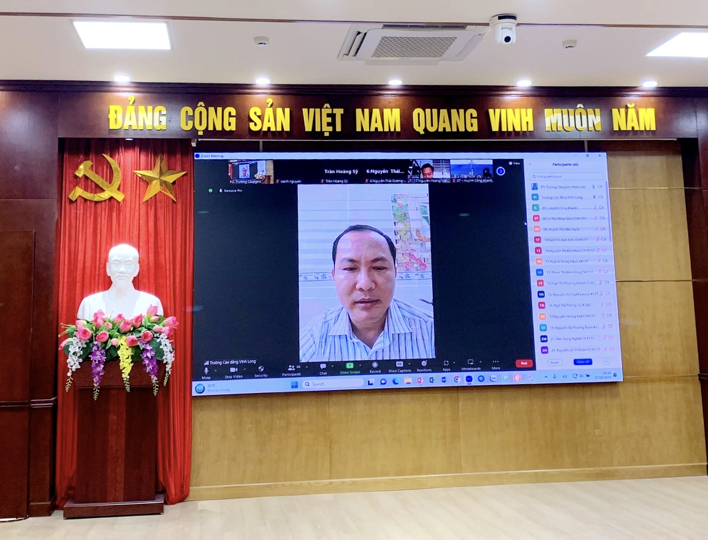 Đồng chí Trần Minh Tố, Bí thư Đảng ủy, Hiệu trưởng Trường Cao đẳng Vĩnh Long phát biểu tại buổi khai giảng qua phần mềm trực tuyến. Ảnh Hồng Loan