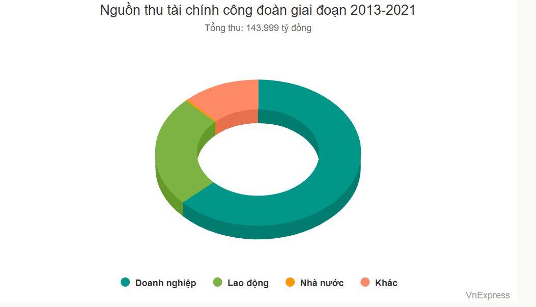 Nguồn thu tài chính công đoàn giai đoạn 2013-2021Tổng thu: 143.999 tỷ đồngDoanh nghiệpLao độngNhà nướcKhácVnExpress