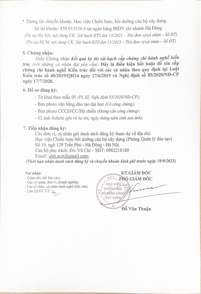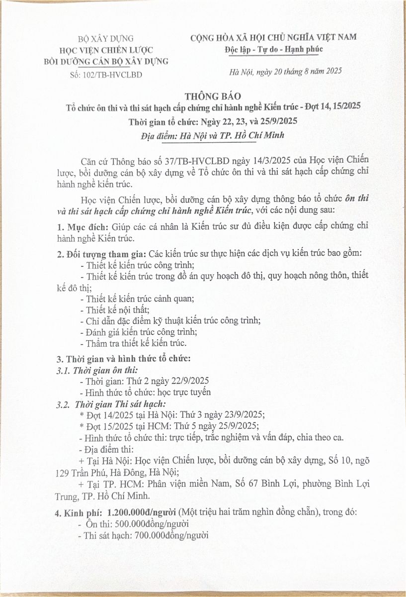Thi sát hạch hành nghề Kiến trúc đợt 14-15 tại Hà Nội và TP. Hồ Chí Minh 09/09/2025 Lượt truy cập : 267 Bình luận : 0 Chia sẻ : Thêm bình luận mới Bình luận của bạn đã được gửi thành công. Cảm ơn bạn! Làm mới Lỗi. Vui lòng thử lại Gửi bình luận