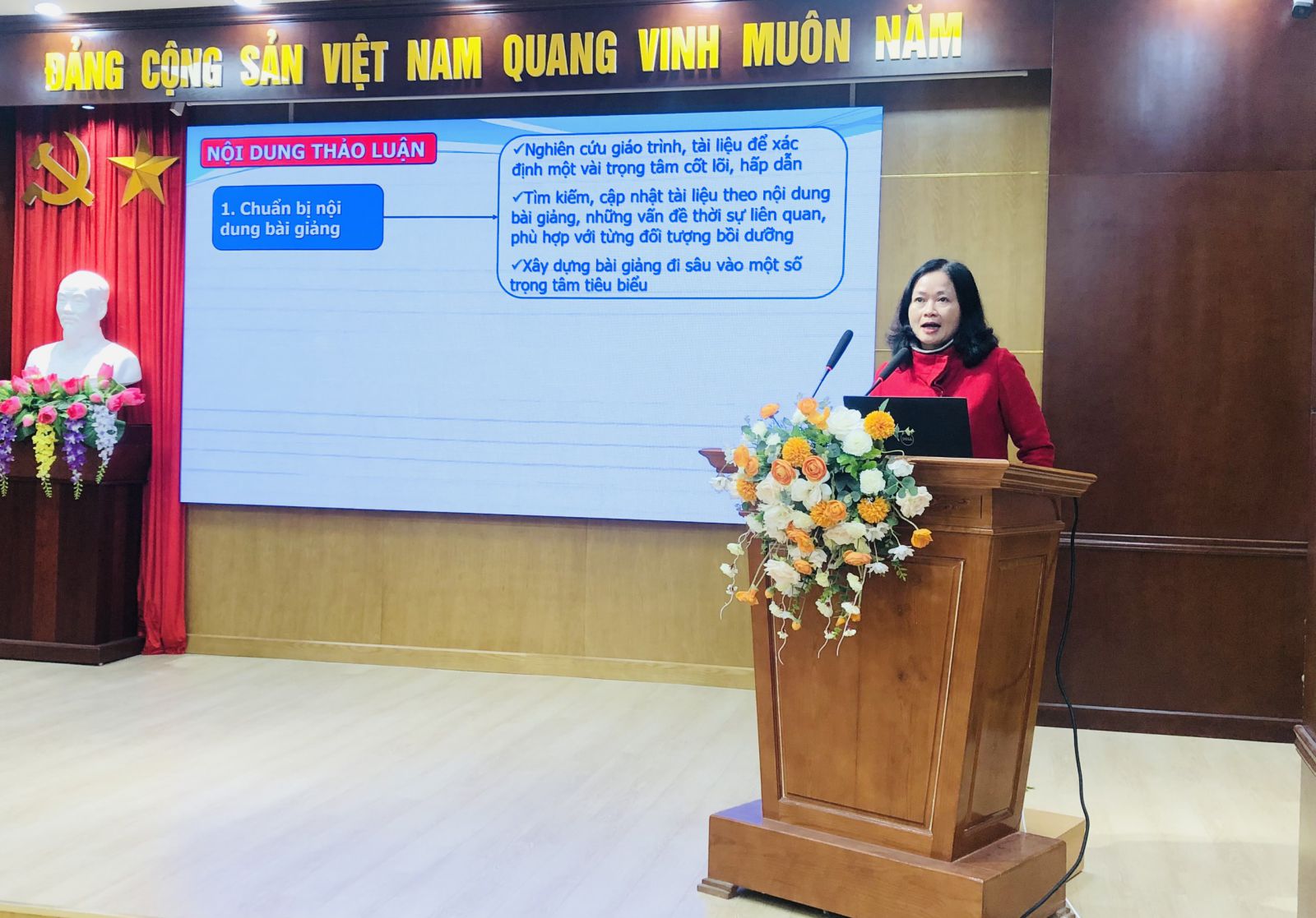 Chuẩn bị nội dung bài giảng gồm: Giáo trình: Xác định một vài nội dung trọng tâm cốt lõi, hấp dẫn; Tìm kiếm, cập nhật tài liệu theo nội dụng bài giảng, vấn đề thời sự liên quan, phù hợp với từng đối tượng mở lớp; Xây dựng bài giảng đi sâu vào trọng tâm, tiêu biểu (Một vài vấn đề cốt lõi, hấp dẫn của bài để phát triển bài giảng), người trình bày đ/c Nguyễn Thu Trang, giảng viên Khoa Quản lý nhà nước.